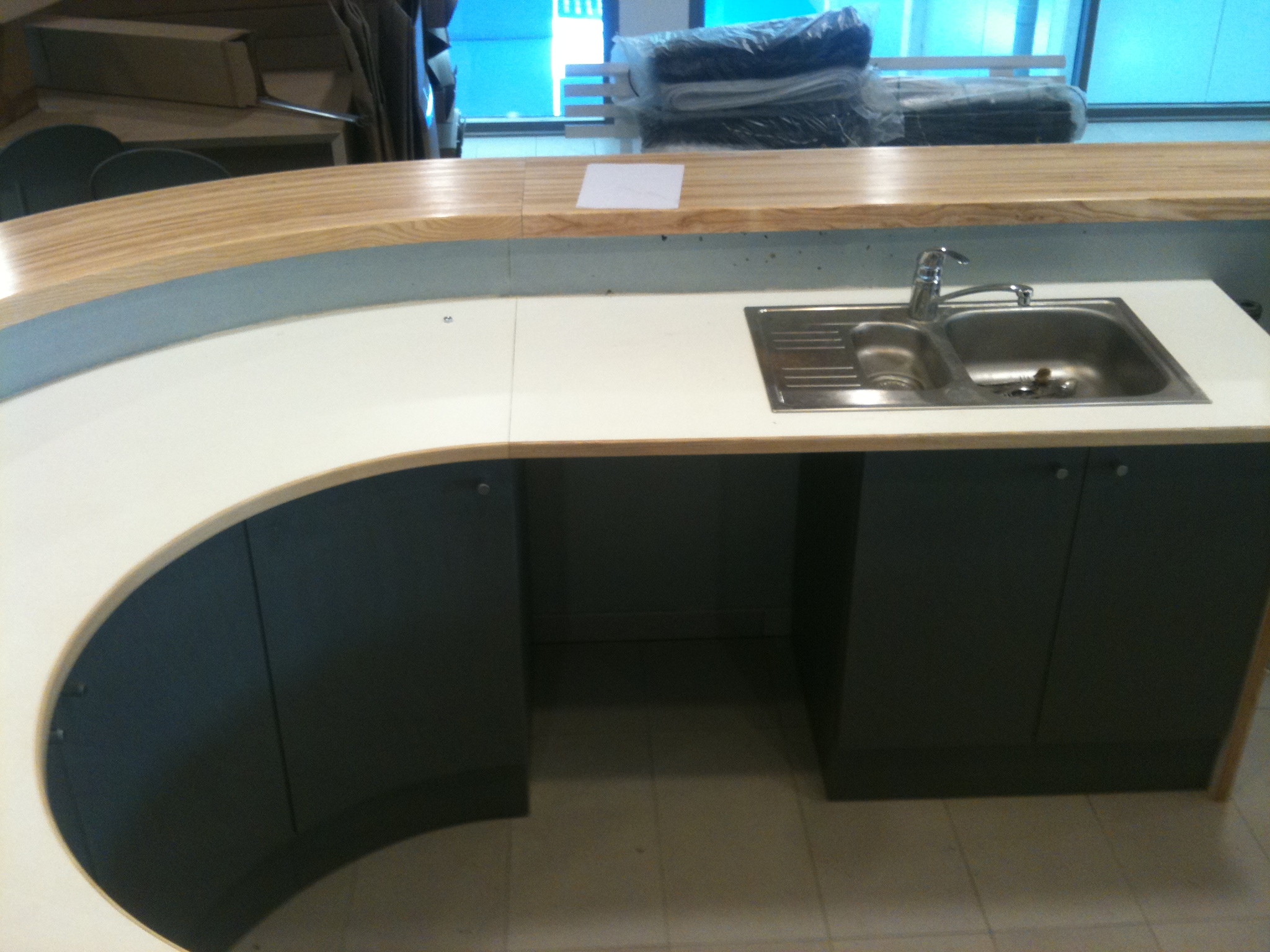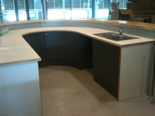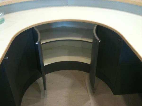 Nous avons réalisé sous un plan de travail existant, un meuble adapté à l'agencement arrondi du bar.