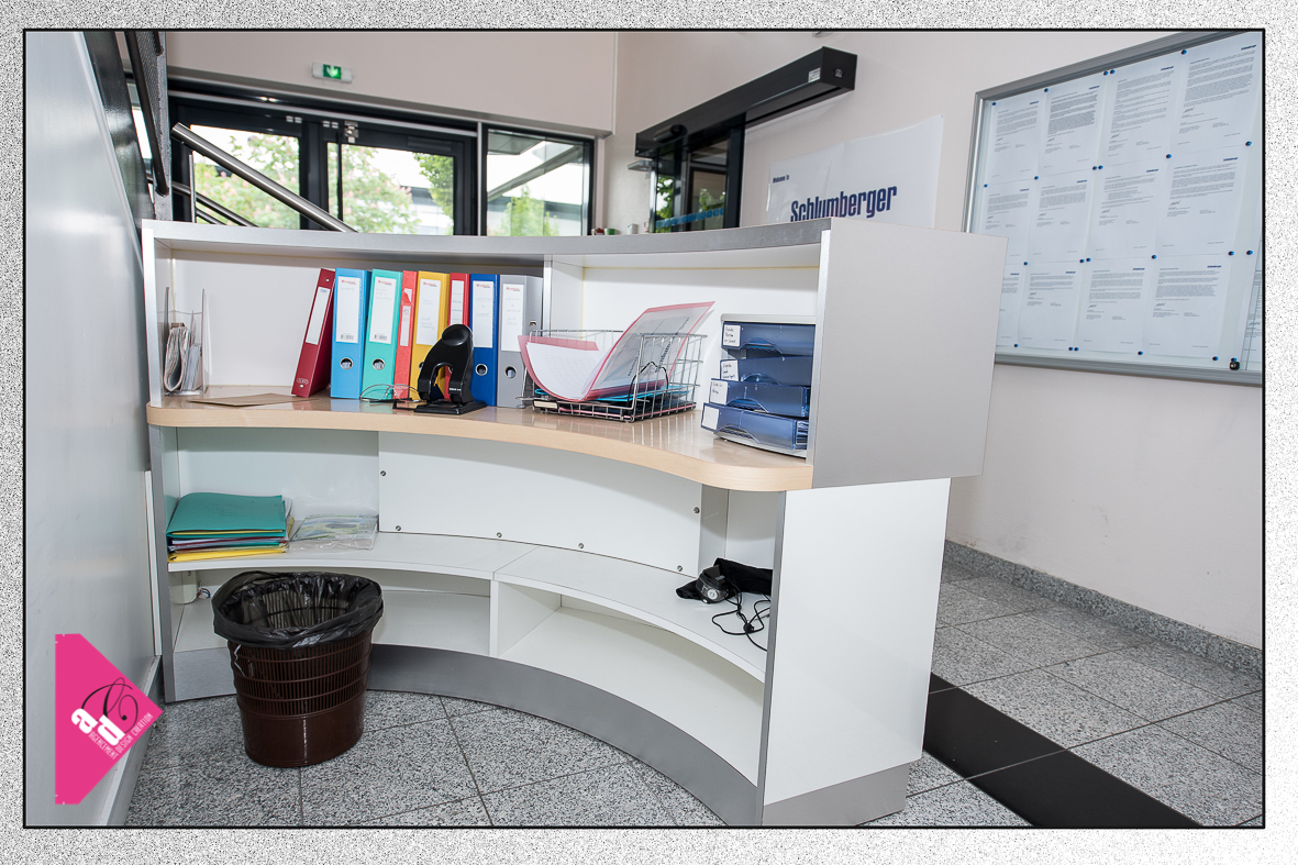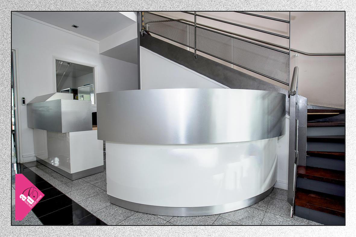 ADC Menuiserie a réalisé une sublime banque d'accueil à l'aide de revêtements stratifiés structurés et d'un liseret aluminium pour le Cabinet d'Ophtalmologie de Saint-Leu-La-Forêt.