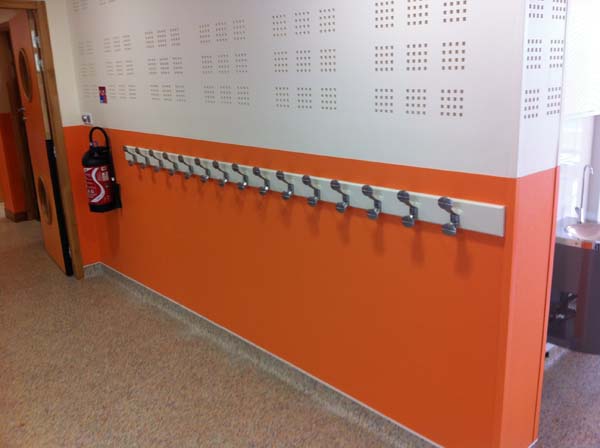 ADC Menuiserie a réalisé des portes manteaux pour une école maternelle. Un porte manteaux en polyuréthane satinée avec des bords arrondis.